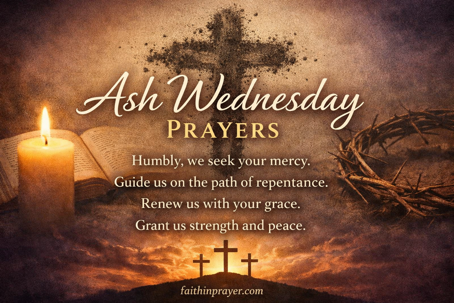 Heavenly Father, as we gather in Your presence on this sacred day, we humbly bow before You. May the ashes upon our foreheads remind us of our mortality and the need for Your mercy. Purify our hearts, enlighten our minds, and strengthen our spirits, so that our prayers, our fasting, and our works of love may bring us closer to You. Guide us in this holy season, that we may live in Your truth and bear witness to Your endless compassion.